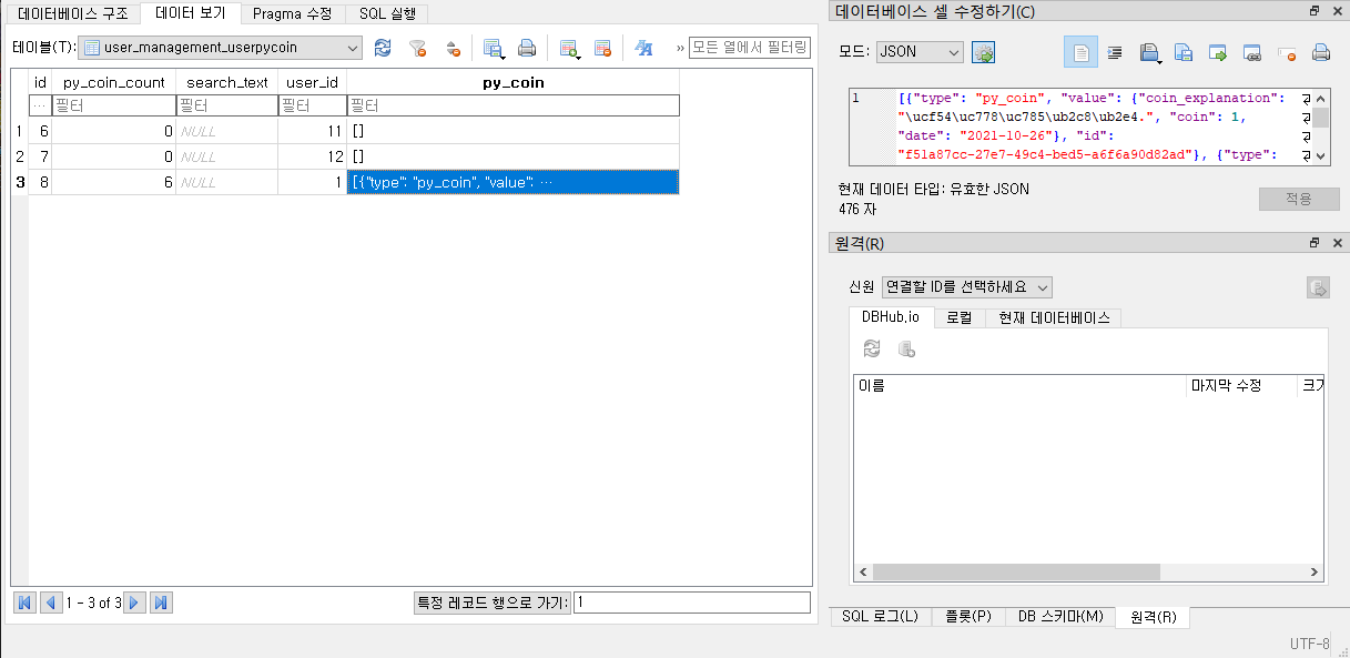 Wagtail이라서 route를 통해서 Ajax 통신을 구현하였다. 앞서 얘기 했던 것 처럼 StreamField는 JSON 형태의 데이터이다. 먼저 어떻게 데이터가 저장되어 있는지 데이터베이스를 통해서 확인해보자.