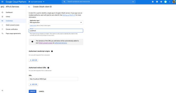 OAuth 클라이언트 ID를 클릭하고 애플리케이션 유형을 웹 애플리케이션으로 설정한다. (이름은 알아서 설정)